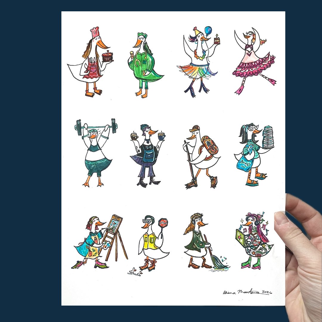 Baker Goose, Doctor Goose, Party Goose, Dancer / Ballerina Goose, Workout Goose, Barista Goose, Hiker Goose, Bookstore Goose, Painter Goose, Crossing Guard Goose, Janitor Goose, and DJ / Music Goose!